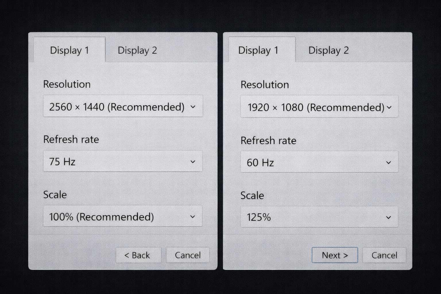 📝 윈도우 디스플레이 설정에서 모니터 해상도·주사율·배율을 나란히 비교한 화면